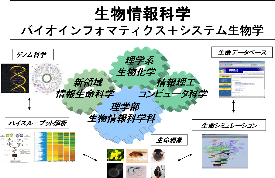 おそらく多くの人は生物情報科学という言葉さえ聞いたことがないでしょう。まずは、生物情報科学とは何かを最初に説明したいと思います。現在、生命科学はヒトを含む多くの生物でゲノムプロジェクトが終了したことを受け、その歴史上もっとも華々しい時代を迎えつつあります。生物情報科学は今後の生命科学の最先端を切り開く新しい学問領域として期待されています。生物情報科学とこれまでの生命科学との大きな違いは、個別の遺伝子やタンパク質を解析するだけでなく、それらの要素が相互作用することによって生命というシステムがどのように構築されているかを実験科学と情報科学の両方を駆使して解き明かす点にあります。生物情報科学は、大きく分けてバイオインフォマティクスとシステム生物学の2つの近接する分野からなっています。まずはバイオインフォマティクスについて説明しましょう。生命科学の分野では、ゲノム配列解析プロジェクトによって、2000年前後に、ヒトを始めとする主要な生物種の全ゲノム配列が解明され、生命科学的な情報や知識が、近年著しく蓄積されてきました。一方、電子情報技術は、社会的にみても、インターネット、携帯電話などに見られるように人間社会のありかたを大きく変えるほどの速さで急激に進歩しています。バイオインフォマティクスとは、生命科学において新たに蓄積されてきた膨大なデータを、最新の情報科学的手法によって定量的に扱う学問分野です。次にシステム生物学について説明しましょう。システム生物学とは遺伝子やタンパク質の個別の要素である「部分」と生命現象のダイナミックな振る舞いである「全体」をシステムの視点から捉える学問分野です。生命現象を実験により観測して、その背後に潜むロジックを数理的なモデルを用いて明らかにしていきます。生命科学を物理や工学のような視点から捉えて理解する感じに近いので、高校で数学や物理は学んだが生物を学んでこなかった人にもその考え方自体は馴染みやすいものと思います。これらの両分野の特徴は、実験(ウェット)と計算機(ドライ)の両方を密接にフィードバックしながら研究を行う点にあります。また、生物情報科学の分野では、生命科学と情報科学のどちらの手法も用いますが、単にそれらを足し合わせたものではなくて、どちらの基礎にも立脚して新しい視点から生命現象を理解する点がこれまでの生命科学と異なるユニークな点であり、10年前には領域そのものが存在しなかった最先端の学問領域です。