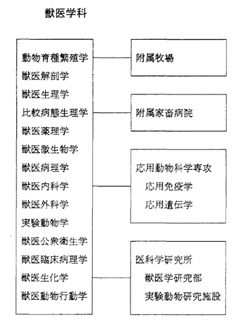 獣医学科は、従来より高等脊椎動物に関する 研究と教育を重点的に行っていますが、現代社 会における食糧増産、安全性研究、環境問題へ の取り組みに対する要望の高まりを背景にして、 獣医学教育6年制への移行も契機となって、近 年大きく拡充発展してまいりました。獣医学科 は従来10講座で構成されていましたが、平成 元年度には2講座(獣医公衆衛生学、獣医臨床 病理学)、翌年度にほさらに2講座(獣医生化 学、獣医動物行動学)が新設され、現在は合計 14講座を抱えるまでになりました。また、同 時期に応用動物科学専攻の2講座(応用免疫学、 応用遺伝学)も新設され、わが学科から2講座 が協力講座として連帯するなど、相互に密接な 関係を保っています。獣医学科の関連施設とし て、農学部附属牧場(茨城県)、農学部附属家 畜病院(弥生キャンパス、昨年度新施設でオー プン)があり、また医科学研究所(港区白金台 )には獣医学研究部と実験動物施設があります。