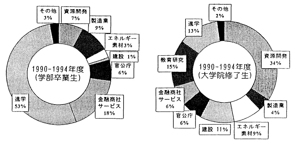 地球システム工学科の専門教育は多岐にわたっているので、卒業生の進出分野は極めて広い(下図)。資源開発関係の分野のみならず、エネルギー素材産業、製造業、建設系、官公庁、金融機関・商社、情報・通信・サービス業、教育・研究機関に進出している。